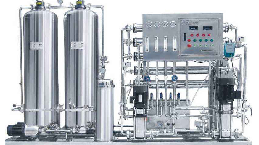 原水→原水加壓泵→多介質(zhì)過濾器→活性炭過濾器→軟水器→精密過濾器→第一級反滲透 →PH調(diào)節(jié)→中間水箱→第二級反滲透(反滲透膜表面帶正電荷)→純化水箱→純水泵→微孔過濾器→用水點