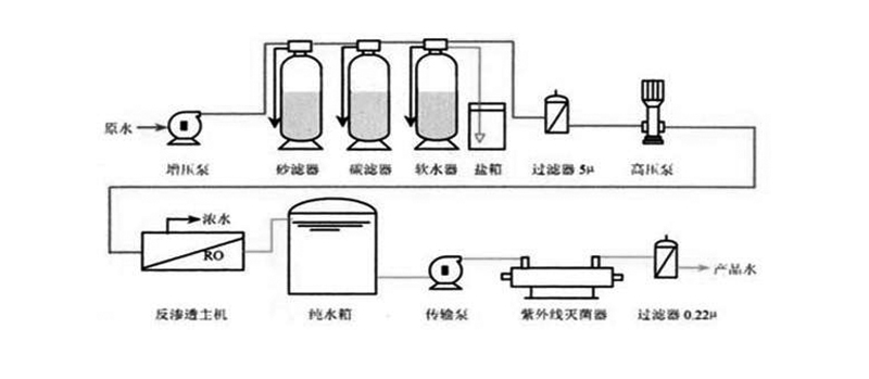 圖二所示是比較高端的超純水機,較圖一增加了雙級反滲透、EDI模塊、紫外光、超濾膜等配件,出水品質(zhì)在所有設(shè)備正常的情況下,可以保證18.2的超純水品質(zhì)。