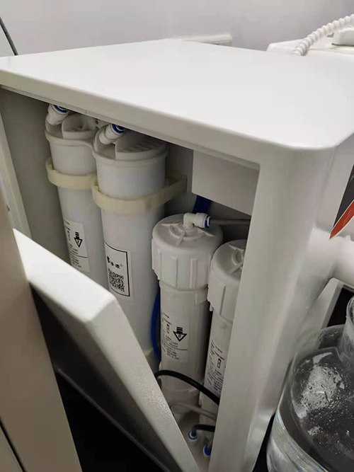 2、打開超純水機主機,去下純化柱的進水和出水PE管,取下純化柱,將準(zhǔn)備好的同等規(guī)格全新純化柱放置于固定卡位上,接好進水和出水管,確認(rèn)純化柱已經(jīng)固定好。